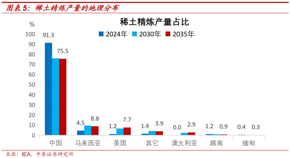 国际能源署根据现有产能和已宣布的稀土工业项目测算,2035年中国和美国的稀土矿产量占全球比例分别为52.3%、8.4%,中、美的稀土精炼产量占全球比例分别为75.5%、7.7%。2035年中国在稀土精炼领域仍然具有强优势,美国稀土精炼产量占比只有中国的十分之一。2035年马来西亚和澳大利亚稀土精炼产量占全球比例分别位居第二、第四,分别占比8.8%、2.9%。