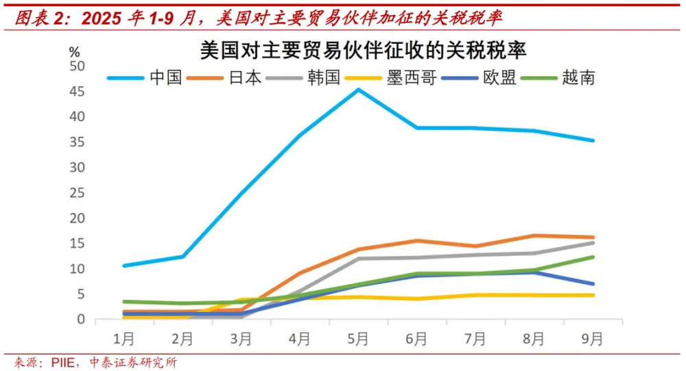 根据彼得森国际研究所的测算,2025年9月(最新,基于USITC的原始数据)美国对华关税税率为35.2%,对全球的平均关税税率为10.4%。在11月初下调10%的芬太尼关税后,美国对华关税约为25%(即35.2%-10%)。