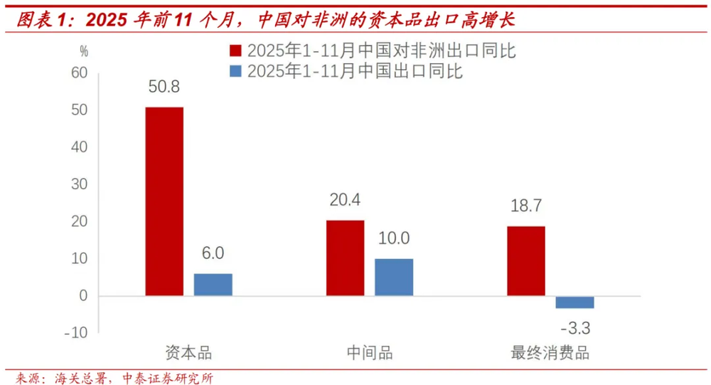 二是中国企业加快出海,对非洲等地区出口高增长。2025年前11个月中国对非洲出口同比增长26.3%,远高于中国对其它主要贸易伙伴的出口增速,对非洲出口拉动前11个月中国总出口同比增长1.3个百分点。