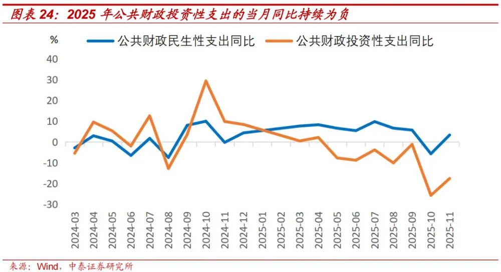 但2025年前11个月,公共财政+政府性基金这两本账支出同比4.5%,较2024年的全年增速仅提高了1.8个百分点。7月主要经济指标的同比开始持续回落,但从8月以来的财政支出数据看,财政似乎并未明显加力对冲。可能原因包括化债、土地出让金减少等因素,限制了地方财政支出,即使2025年的广义财政赤字有明显增加。