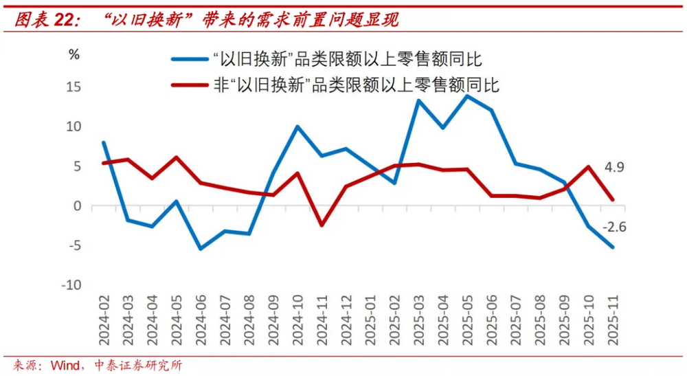 随着“以旧换新”补贴退坡,需求前置的风险开始暴露。2025年5月到11月,6个月时间里,限额以上零售中和“以旧换新”相关的五个品类,零售额当月同比从13.8%下降至-5.3%。对比来看,其他限额以上品类的零售额同比,同期只从4.5%下降到0.7%。