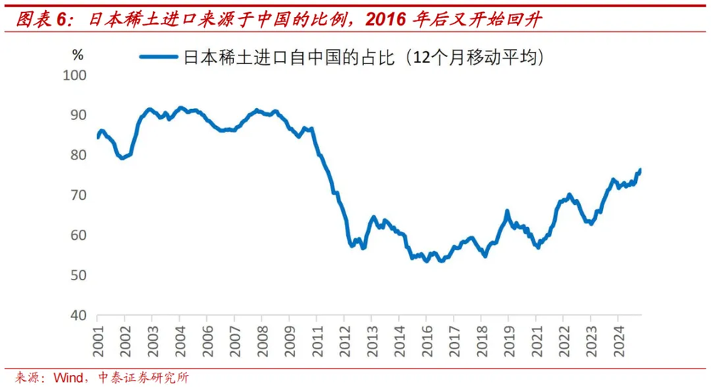 中国此前对日本的稀土禁运,也为美国提供了前车之鉴。2010年由于地缘争端,中国对日本实施稀土禁运。日本开始寻找稀土替代和发展精炼技术,但成效并不大。日本稀土进口来源于中国的比例,在历经五年下降后,又从2016年的低点53%左右,持续回升到2025年的75%左右。日本寻求降低对中国稀土依赖的曲折探索经验,也强化了目前中国所实施的稀土出口管制战略的正确性和威慑力。