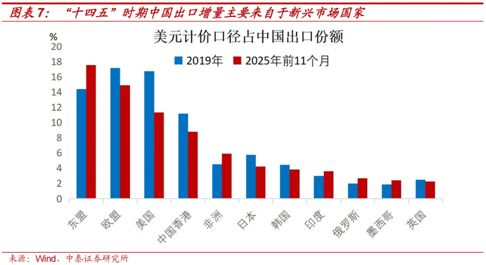 2023年中国对“一带一路”沿线经济体的出口首次超过美欧日。对比2019年和2025年前11个月,中国出口里主要贸易伙伴的占比,可发现“十四五”时期中国出口的增量主要来自于新兴市场和发展中国家。相较于发达经济体,新兴市场和发展中国家的经济增速更高,外溢的进口需求也更强。