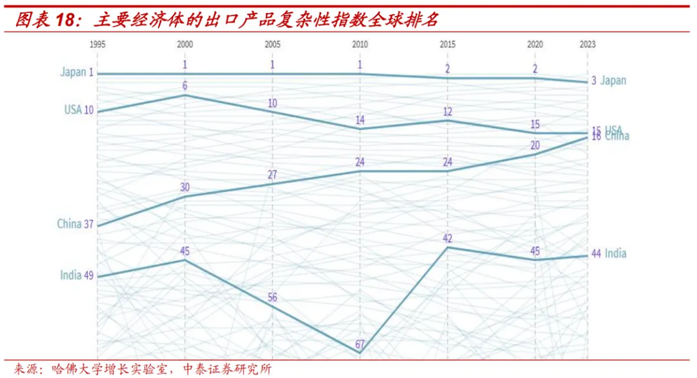 哈佛大学增长实验室公布的出口产品复杂性指数,从出口视角,衡量一个国家制造业的科技水平。这个指数显示,中国出口产品的科技含量全球排名加速提高。2010年和2015年,中国出口产品复杂性指数都位居全球第24名,此后用5年时间提高到2020年的第20名。2020年到2023年,提升速度加快,三年时间提高到了第16名。