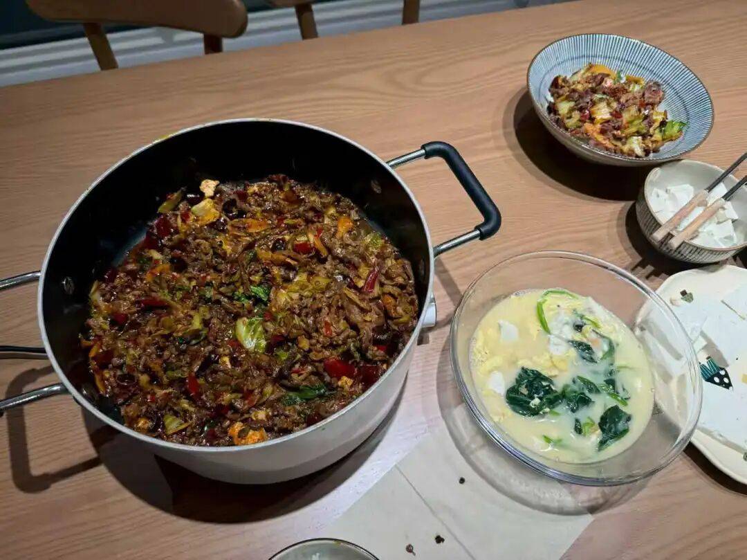 *小智爱人烹饪的青菜牛肉和虾仁豆腐汤(小智供图)