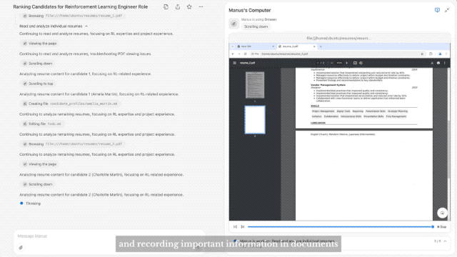 在视频中,团队首席科学家Peak(季逸超)展示了Manus如何像人类一样工作:收到一个包含10份简历的压缩文件后,它自动解压、逐份阅读、记录关键信息,最终输出排名建议和候选人评估报告。
