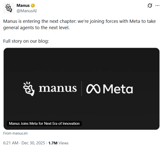 Manus的X账号用一句简洁的话官宣了这一消息:Manus 正式开启全新篇章,我们将与 Meta 携手,推动通用AI智能体迈向全新高度。