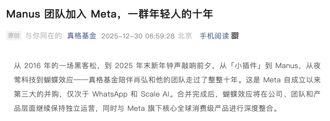 不管怎么说,祝贺Manus,祝贺以真格为代表的早期投资人们,也祝贺Meta。