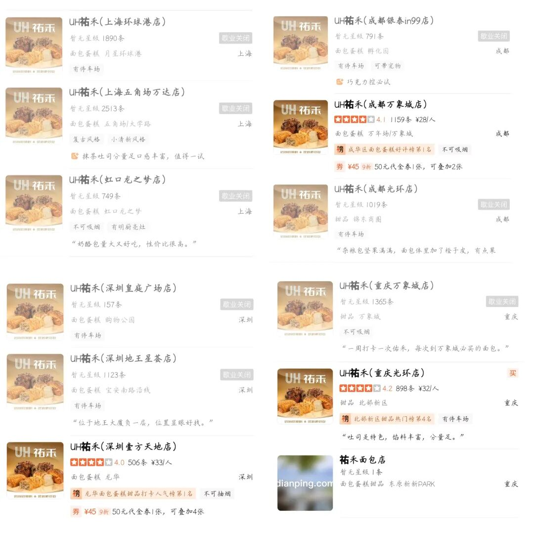 值得注意的是,目前祐禾在上述城市均有门店仍在营业中,品牌并没有撤出。以上海为例,关了三家门店后,仍有12家门店正常经营。