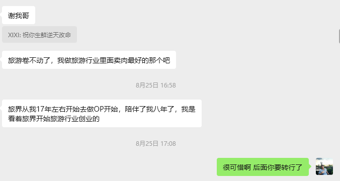 创业后的前四年不必多说,他熬过了停摆和熔断,甚至在2023年还信心满满地去京郊搞了民宿,但2025年暑期旺季时,他却和我说,自己要去转行卖羊肉,从旅行社变成肉贩子。