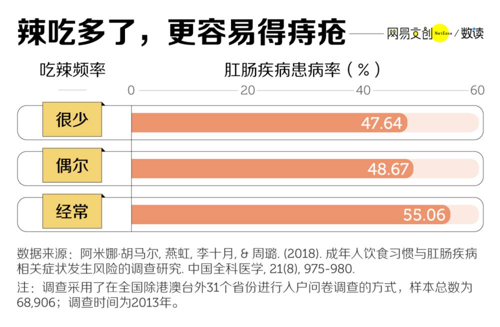 的确,相比很少吃辣人群的 47.64%,经常吃辣的人的肛肠疾病患病率上升到 55.06%,增幅接近 10% [4]。