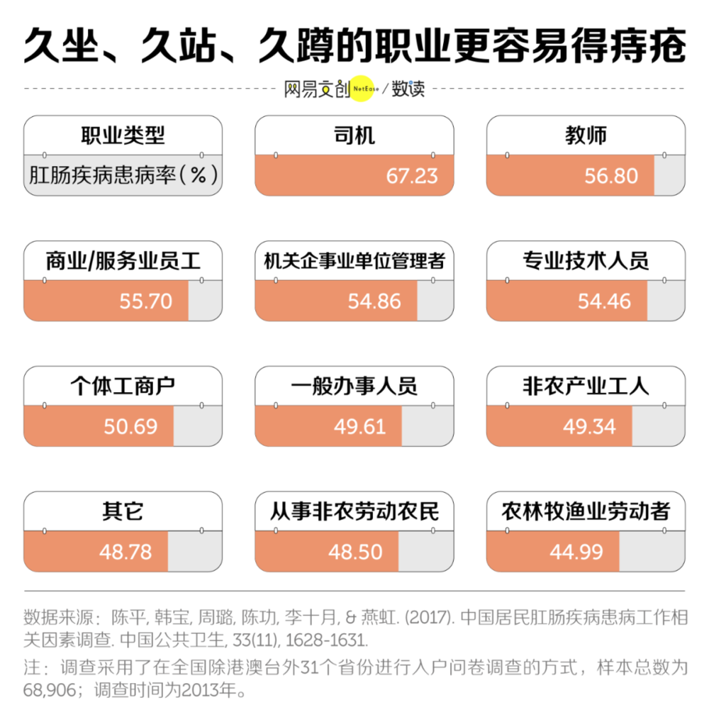 《中国成人常见肛肠疾病流行病学调查》的数据显示,每天保持不良姿势(如久站久坐) 4 小时以上者肛肠疾病患病率为 56.67%,而保持不良姿势小于 1 小时的人群该比例仅为 44.95%,前者比后者患病率高了 11.72% [1]。