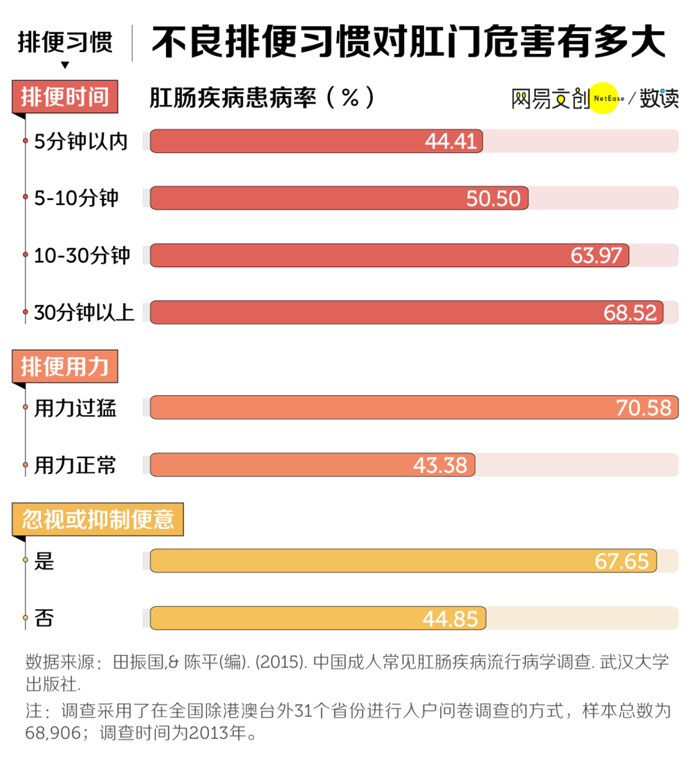 根据《中国成人常见肛肠疾病流行病学调查》的统计,排便时间超过 30 分钟,肛肠疾病患病率相较正常水平上升近 20%,达到 68.52%。而如果能将排便时间控制在 5 分钟以内,这一数字将回落到 44.41% [1]。