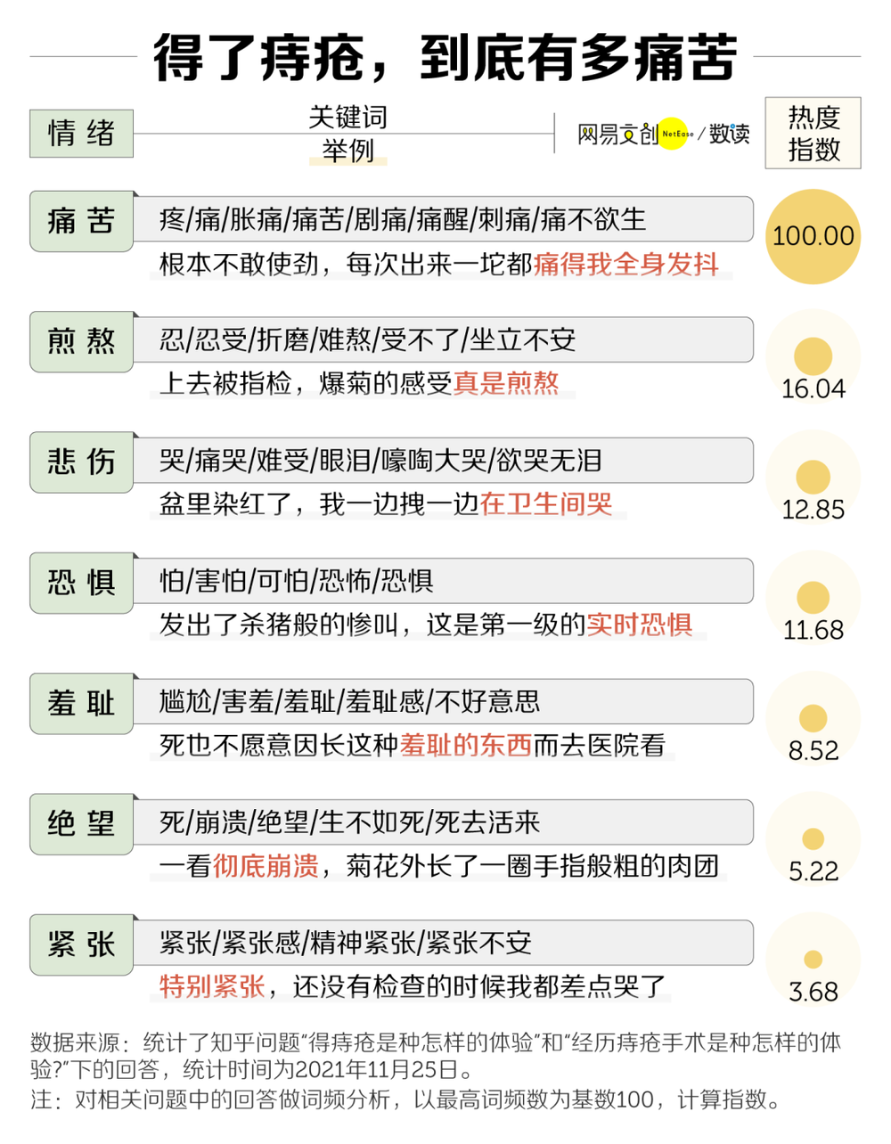 在 3000 多位不同年龄、不同性别的“痔士”留在知乎上的得病故事中,能看到各式各样混杂着恐惧、悲伤与紧张的故事。其中,最突出的情绪就是痛苦。