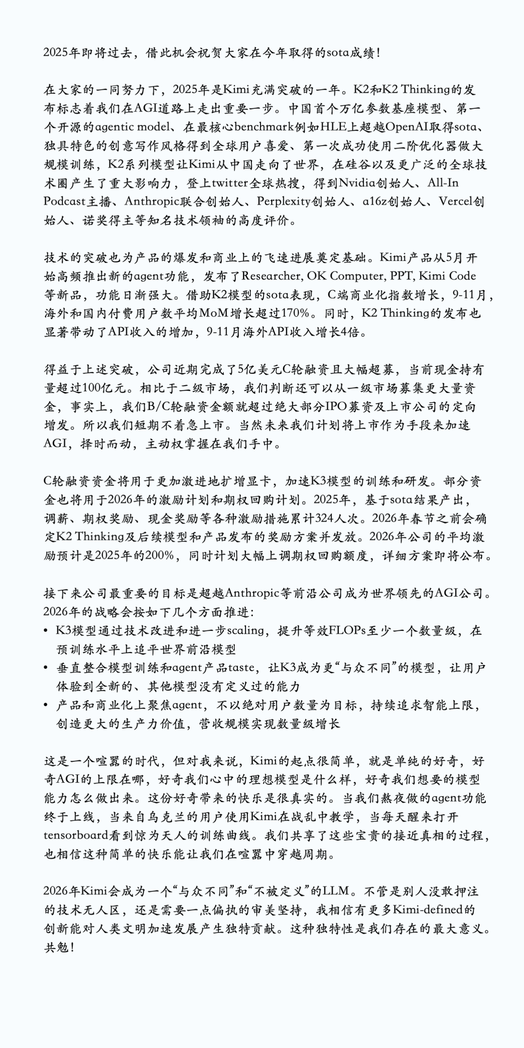 此外,杨植麟也在内部信公布了2026年战略布局: