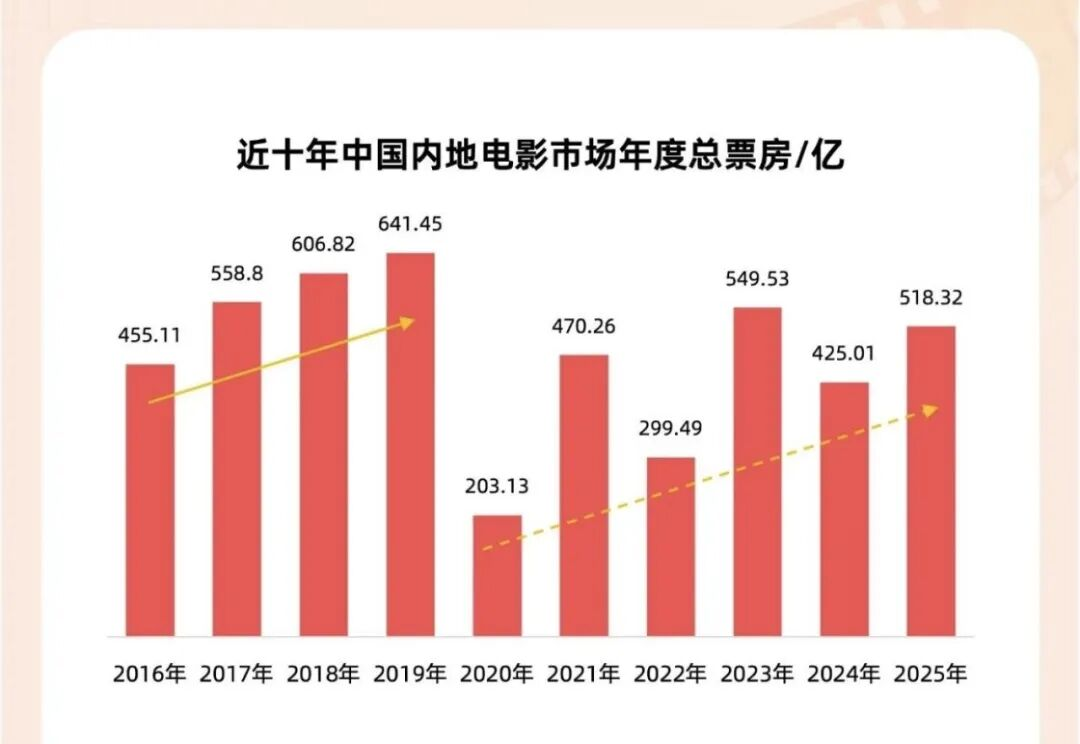 据国家电影局统计数据显示,2025年全国电影票房518.32亿元,国产电影票房412.93亿元,占比为79.67%,城市院线观影人次为12.38亿,破亿影片51部。从数据上,去年票房同比增长21.95%,呈现出逐渐复苏的态势。