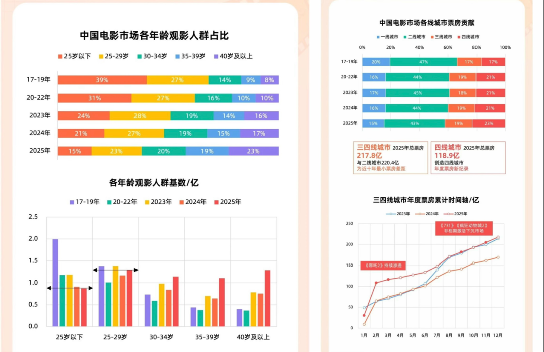 反映在数据上,就是观众构成的改变。《2025中国电影市场年度盘点报告》显示,今年40岁及以上观众占比达23%(历史最高),三四线城市票房贡献占比达42%,。,达到217.8亿,与二线城市的220.4亿相当,为近十年最小票房差距。这清晰表明,观影主力正在发生圈层化与结构性迁移,年轻观众在减少,而成熟观众和下沉市场已经成为了不可或缺的票房增量。
