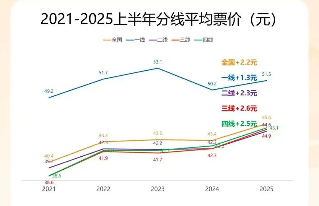 今年上半年,全国平均电影票价已攀升至45.6元,创历史新高。其中,一线城市均价达到49.6元,而三、四线城市的票价也涨至42元左右,甚至在一些县城的特殊档期,出现了票价高于大城市的现象。尽管年初曾有“19.9元特惠票”的短暂回归,但并未能扭转整体高企的票价格局。对于价格敏感、选择多元的年轻观众而言,这张越来越贵的电影票,正在实实在在地改变他们的消费决策。