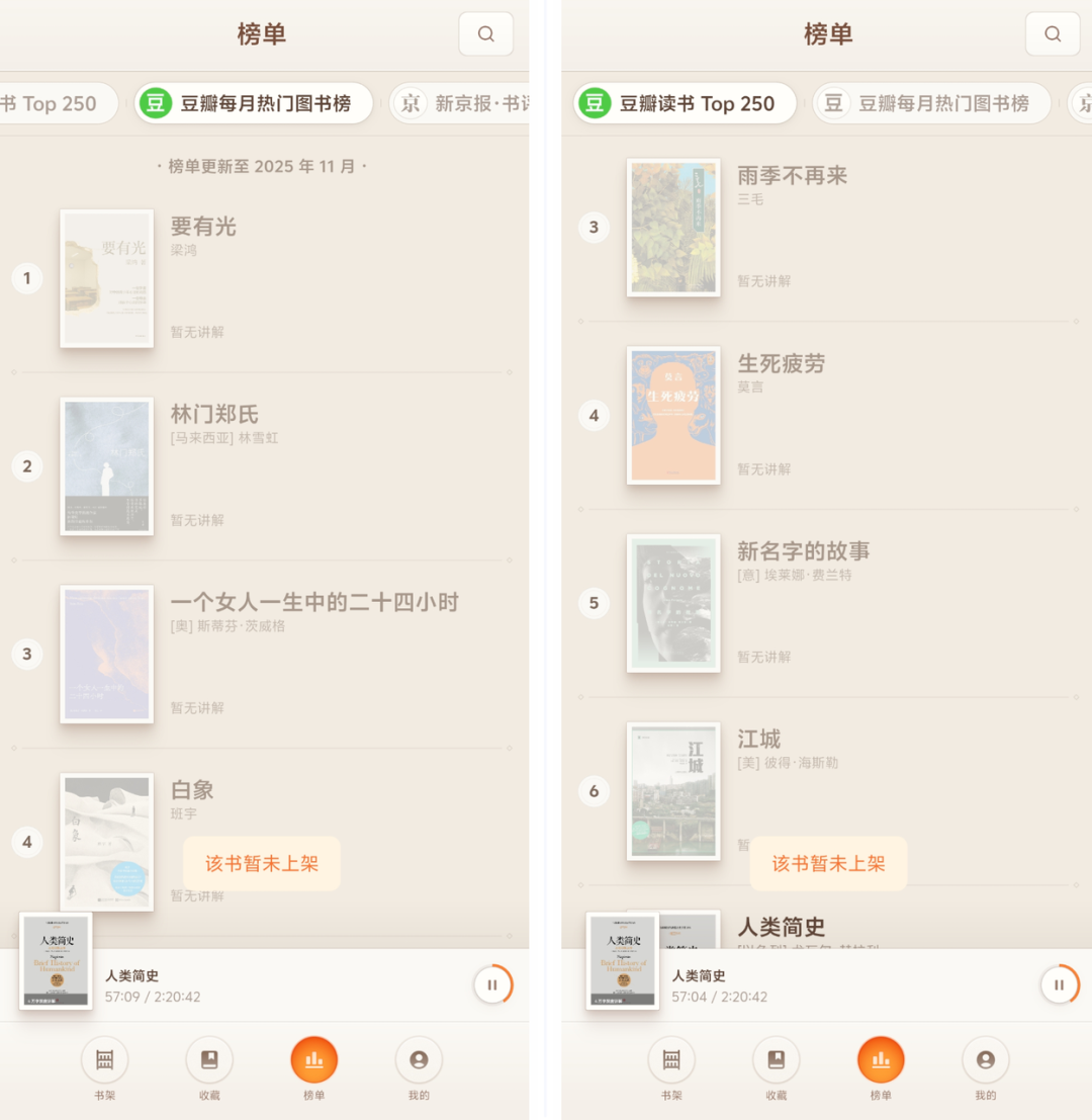 随着喜马拉雅、得到、微信读书的音频化内容、各类书摘播客也都在陆续覆盖这个领域。光靠“权威榜单+AI 音色”这点差异化,根本撑不起核心壁垒。用当下流行语来说,“且听”不亚于站在了微信读书、喜马拉雅的“斩杀线”上。