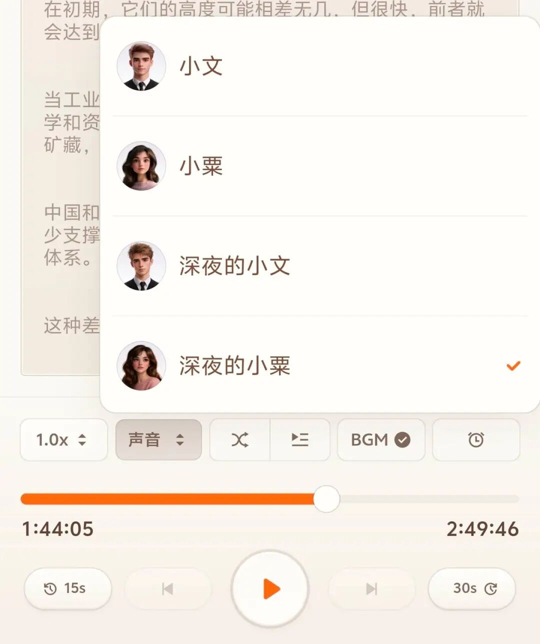 更深层的亮点,是“且听”精准抓住了传统听书产品的命门。现在市面上的听书产品,大多是 TTS 机械朗读;“且听”靠 AI 加持,小文、小栗等拟真音色听起来比较自然,没有明显的机械感,体验上更胜一筹。