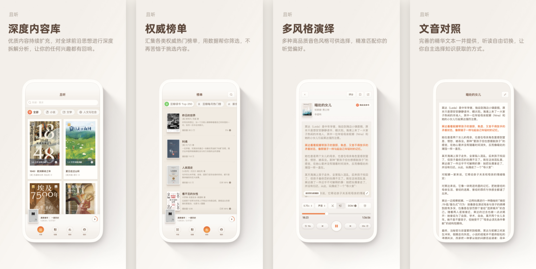 功能上倒也没太多花活,“且听”提供了深度内容库、权威榜单、拟真 AI 音色、文音对照,都是围绕“高效听书”做的加法。