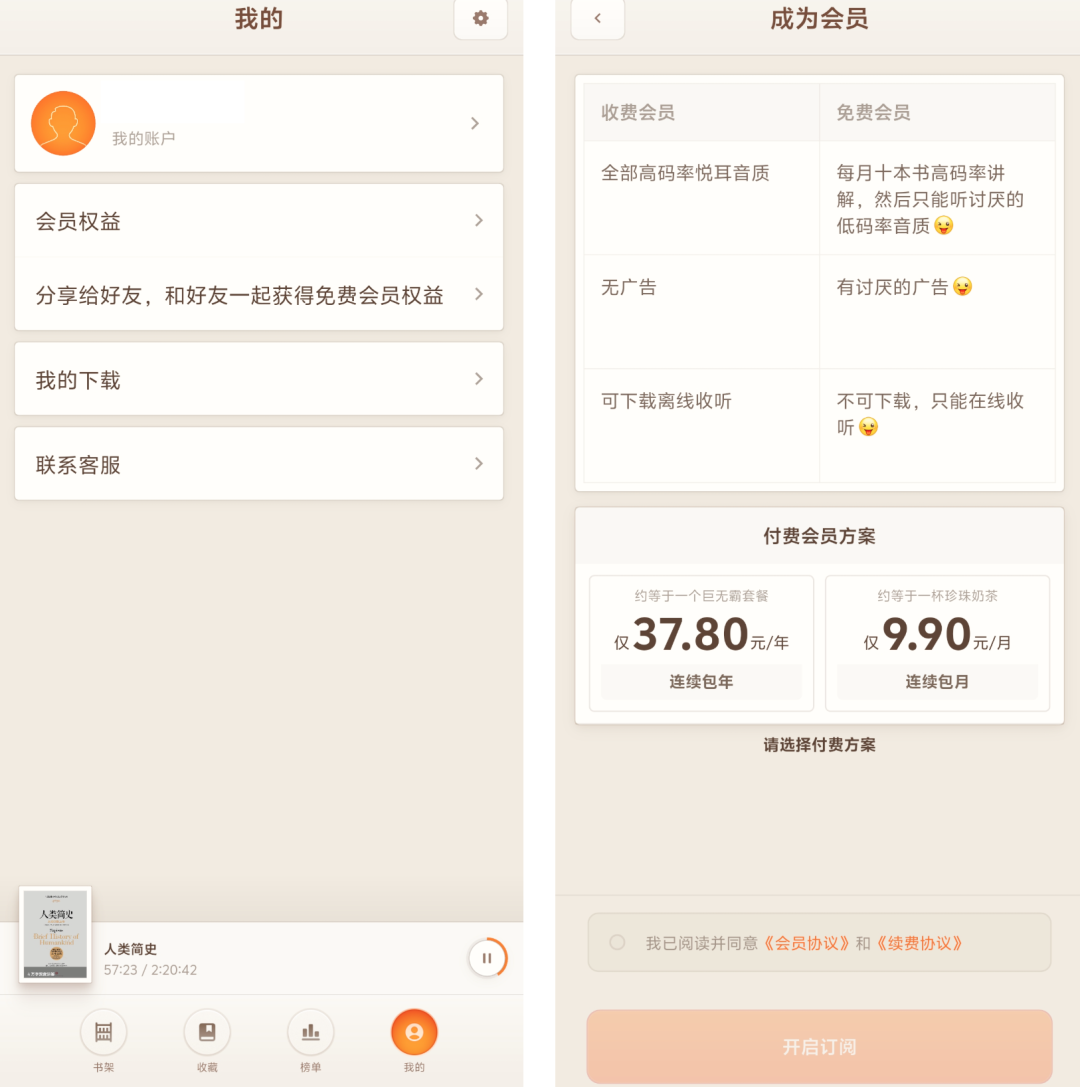 在诸多问题中,唯一让人挑不出错的,可能是它的定价策略——连续包年 37.8 元,相当于一个巨无霸套餐;连续包月 9.9 元,也就一杯珍珠奶茶钱。免费会员每月能听 10 本高码率讲解,其余是低码率+广告,不能下载。