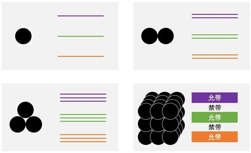 单个原子核的周围存在电子能级,两个原子核靠在一起时,由于它们会相互作用(电荷之间会相互排斥或吸引),原来的每个能级都会劈裂开来变成两个。更多的原子核聚在一起,能级就分裂得更多。一块肉眼可见的材料中,原子核数量多到数不清,能级也就变得多如牛毛。能级与能级之间的缝隙极为狭窄,最终就汇聚成了模糊一片的允带(allowed band)。