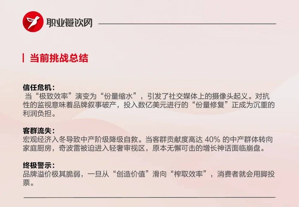 如今奇波雷遭遇的舆论反噬,是一个深刻的警示:当品牌逻辑从“创造价值”转向“榨取效率”,坍塌便已开始。一旦精准的成本控制让消费者感知到“被算计”,在干瘪的钱包面前,消费者只能用脚投票。
