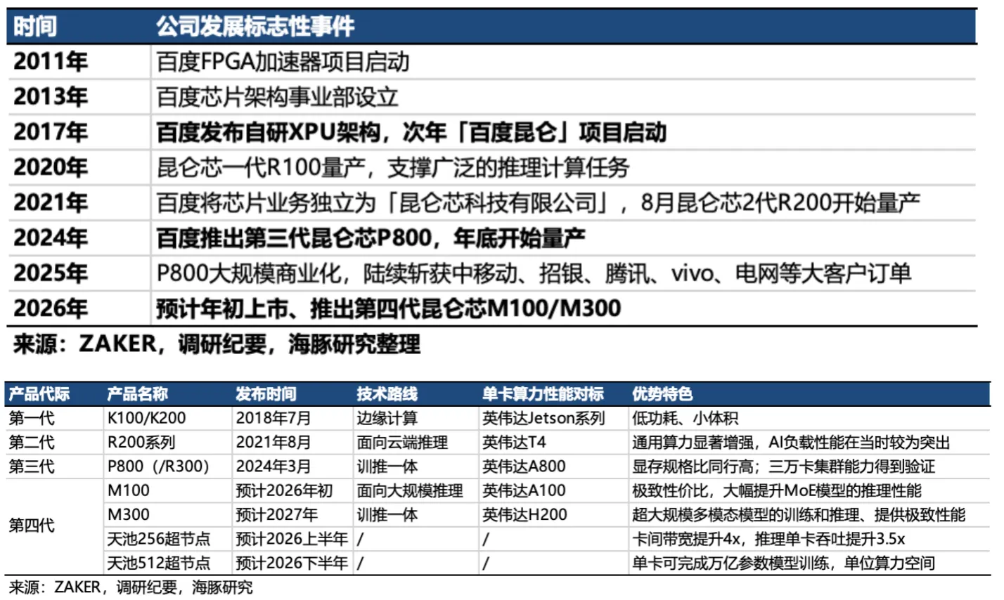 昆仑芯的源头可追溯至百度 2011 年启动的 FPGA 加速器项目,历经多年技术沉淀,2017 年发布自研 XPU 架构,2021 年正式独立为公司。截至目前,已迭代三代产品,主力交付的第三代 P800 芯片对标行业主流产品,后续还规划了 M100、M300 等新一代产品。