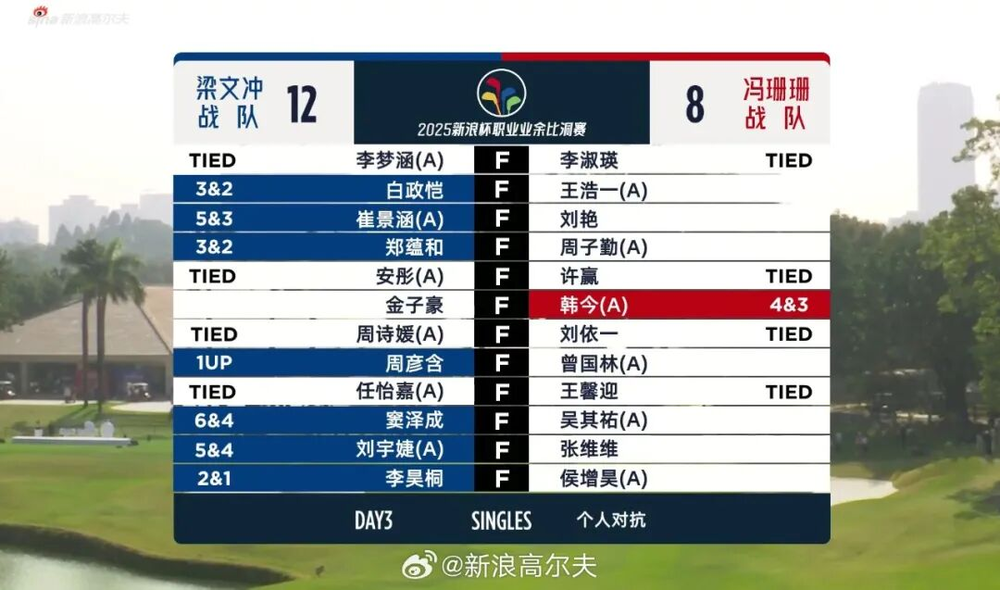 五年后,再次担任蓝队队长的梁文冲进一步评价:“参加新浪杯相当有意义,真的无关乎输赢,而是在于共同进步。”回看历届新浪杯,屡有打出代表作的业余球员,如今已经在职业赛场一展才华。2020年,15岁的殷小雯战平当时的女子中巡“五冠王”张维维,如今已在LPGA打拼三个赛季;2021年,丁文一战平张蕙麟,之后丁文一快速成长,一度成为世界业余排名第一,今年以职业球员身份征战了完整赛季的DP世界巡回赛;2024年,张维维与周诗媛、任怡嘉先后较量后,评价两位小姑娘是强劲的“后浪”,今年两人果然继续在女子中巡有冠军斩获。