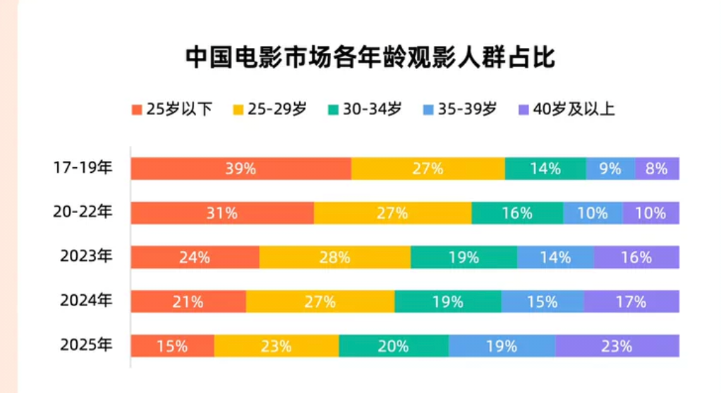 与此同时,年轻观众的持续流失,成为行业心头最深的隐痛。灯塔报告显示,25岁以下观众的占比,已从2017-2019年的近40%,滑落至2025年的15%。电影,这项曾经最潮流的娱乐方式,在Z世代眼中正变得“传统”甚至“过时”。他们的时间和消费被短视频、游戏、线下演出、乃至社交媒体上的“电子榨菜”无限分流。当电影不再是年轻人的“必需品”,而是众多“可选品”之一,这迫使电影必须提供无可替代的沉浸体验或社交价值,才能赢回他们。