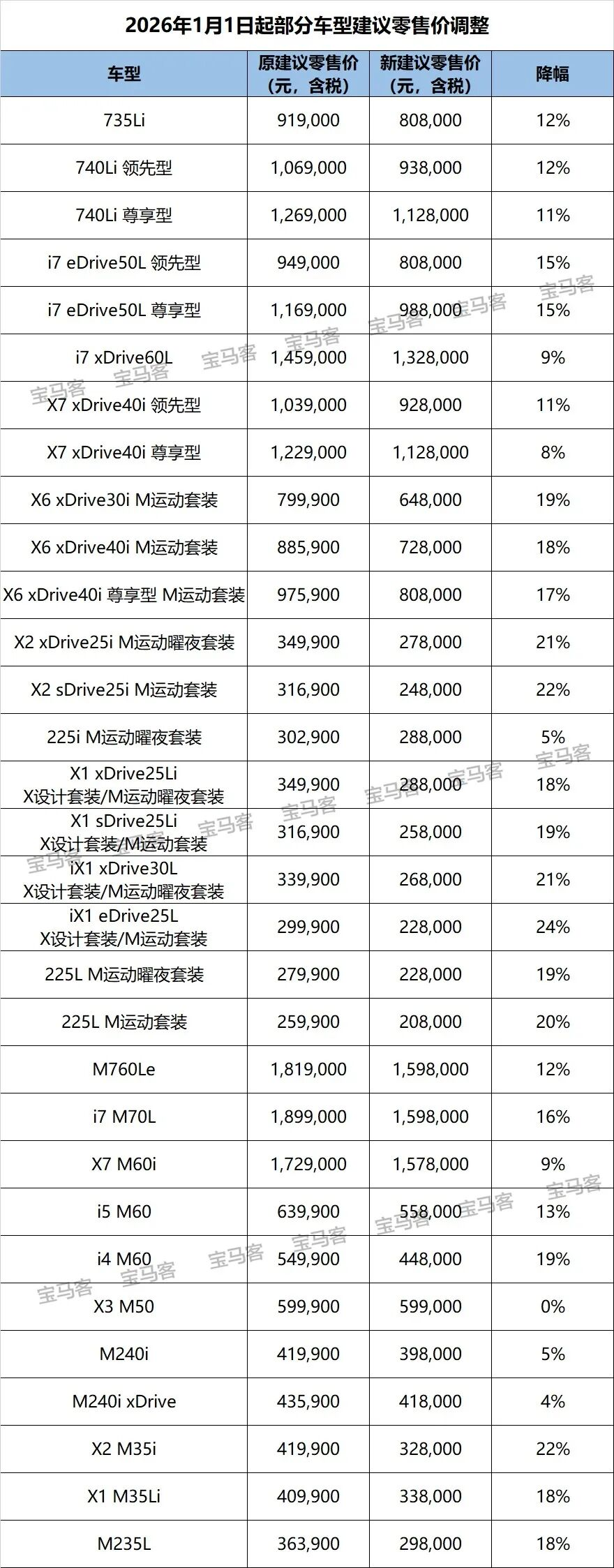 2026年的第一天,宝马来了一波大降价,从入门级到旗舰级,共涉及31款车型。