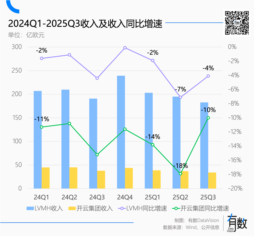 LVMH品牌矩阵相对多元,皮糙肉厚之下勉强能稳住阵脚。经历六个季度下滑后,在2025年Q3终于止跌,营收同比下滑4%,有机增速1%[6]。