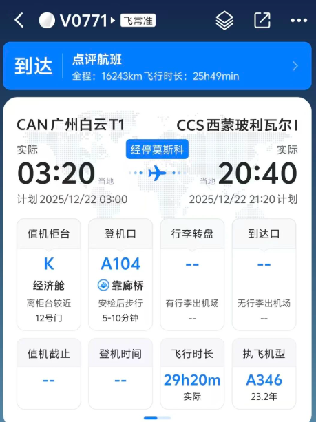 航程很长,需要经停莫斯科。飞常准显示,全程接近30个小时,妥妥的铁腚航班。