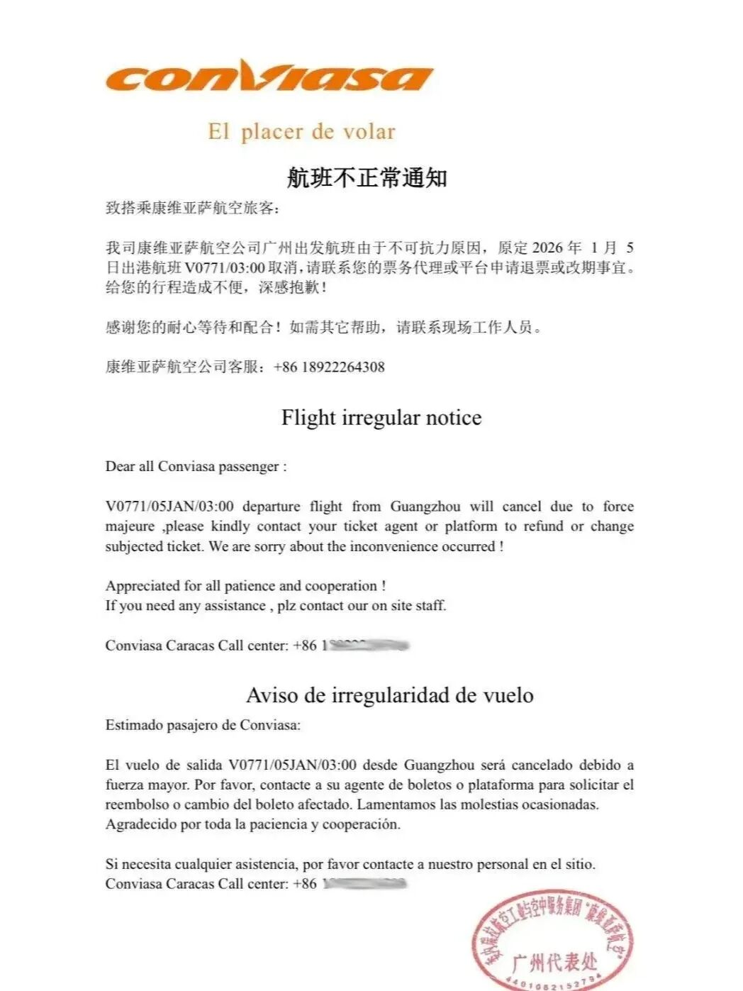 几小时后,更多细节浮出水面,该航司发布通知,原定于1月5日凌晨起飞的广州至加拉加斯航班取消,可以全额退票或改签。