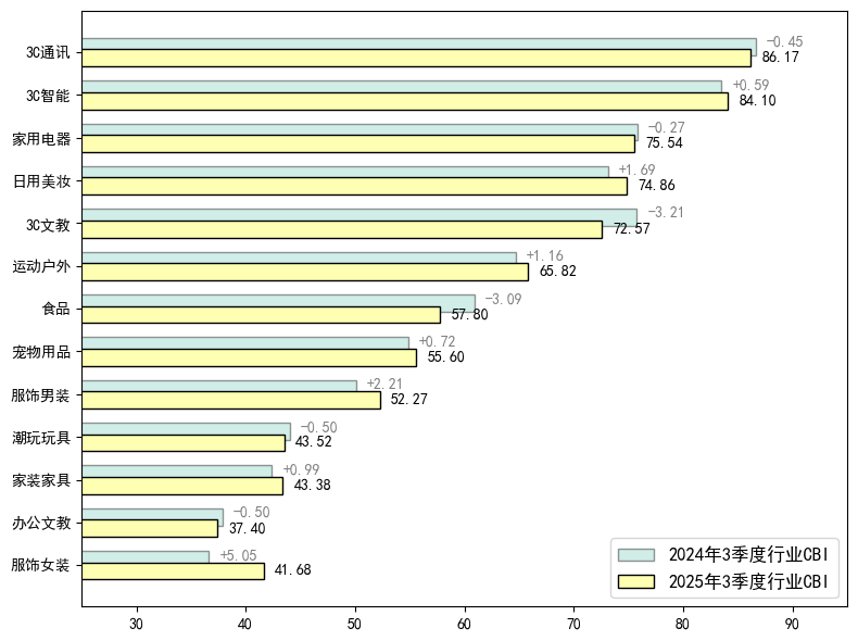 主要行业的消费品牌指数对比(2024年3季度与2025年3季度)