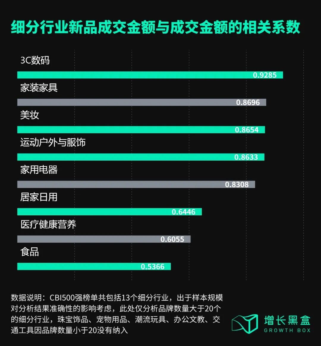 食品行业的新品成交金额与成交金额相关性最弱,这或许有些反常识,在上新最高频的食品行业——品种、口味、包装、联名层出不穷,新品对成交额的驱动力却最弱。