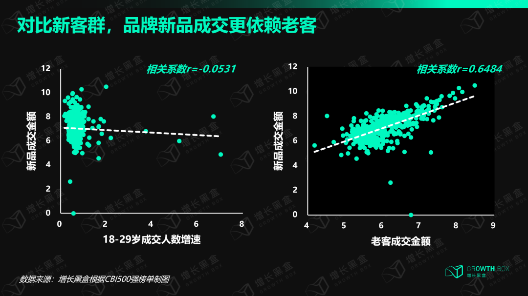 以尤受重视的年轻人群体来说,通过将500个上榜品牌的18-29岁成交人数增速与新品成交金额进行相关性分析,我们发现相关系数接近0,两者并无太多相关性。这意味着,品牌的新品销售并不依赖年轻用户规模的增长。
