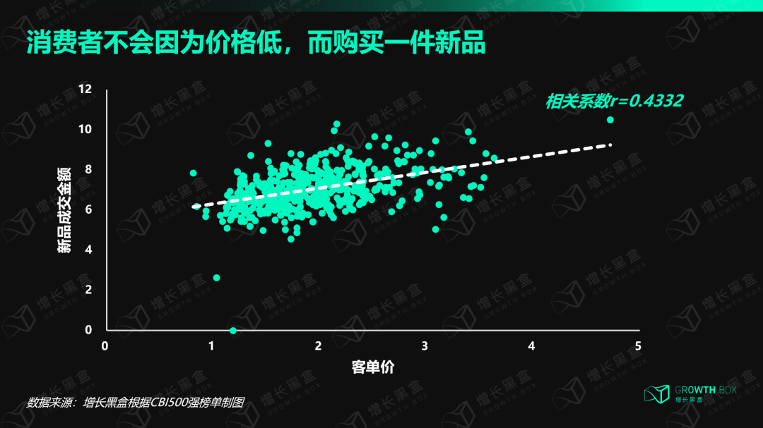 我们将500个上榜品牌的客单价与新品成交金额做了相关性分析,两者的相关系数为0.43,相关性并不显著。这意味着,消费者并不会因为价格低,而购买一件新品。