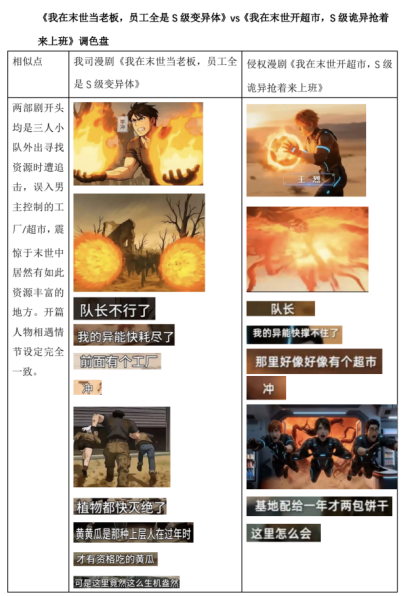 从漫谭提供的文件来看,《我在末世开超市》与《我在末世当老板》在剧情内容、人物关系等,的确如文件中所说,存在多重相似之处。