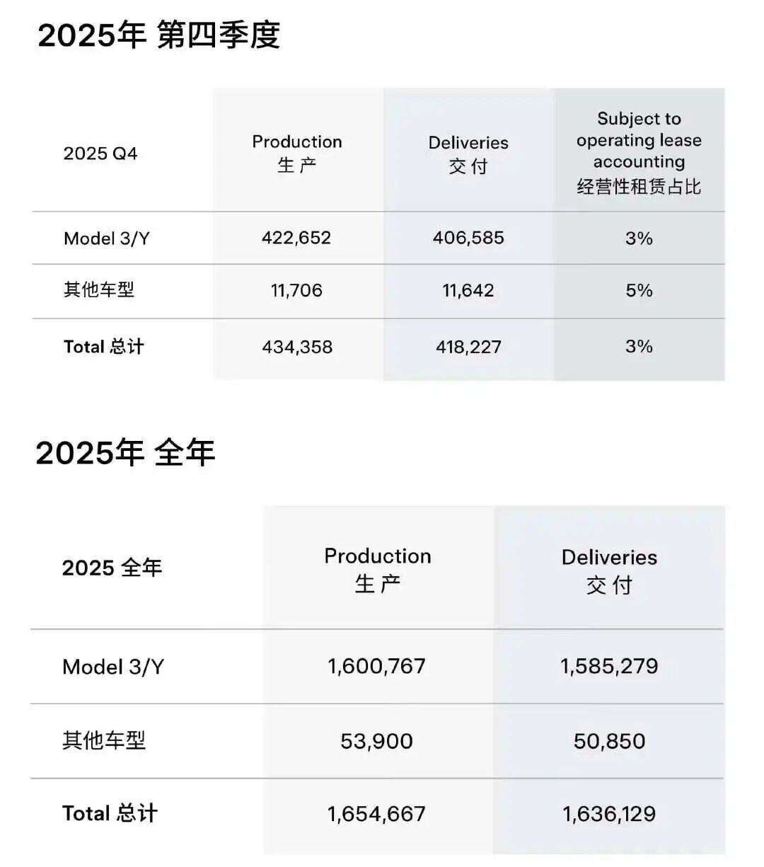 整体较2024年的178.9万辆下滑幅度达8.6%,低于市场预期的165万辆。这也是继2024年同比下滑1%至178.9万辆之后,特斯拉连续第二年销量出现下滑。
