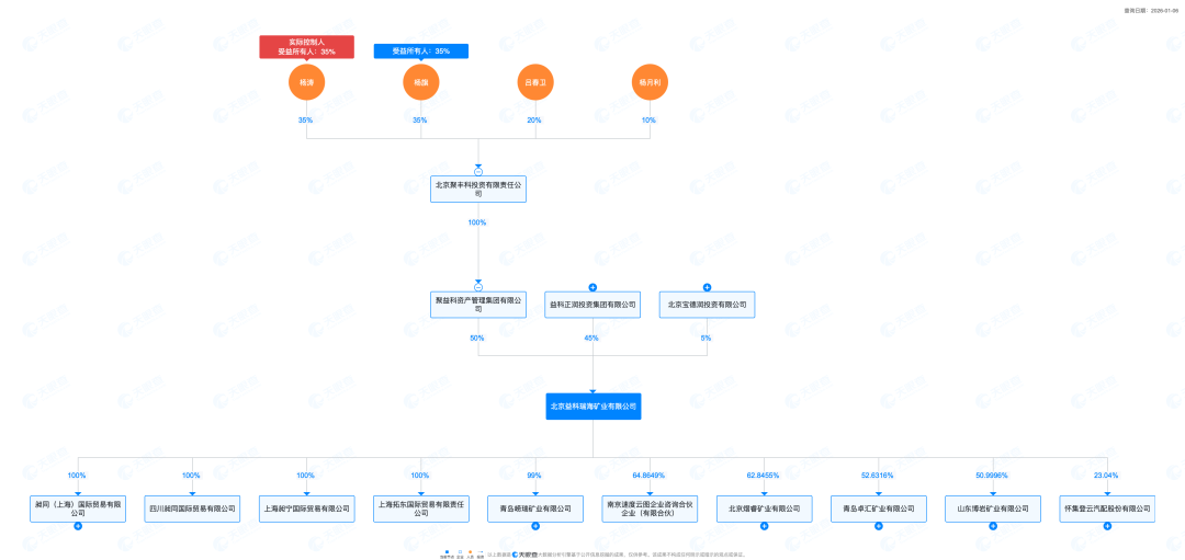 杨涛早期参与家族企业运营,以总经理身份执掌河南汇源化工集团。随着“益科系”扩张,杨涛逐步接手核心业务,先后担任北京聚丰科投资有限责任公司法定代表人、聚益科资产管理集团有限公司董事等关键职务,成为“益科系”矿业投资、金融服务两大核心板块的核心决策人之一。