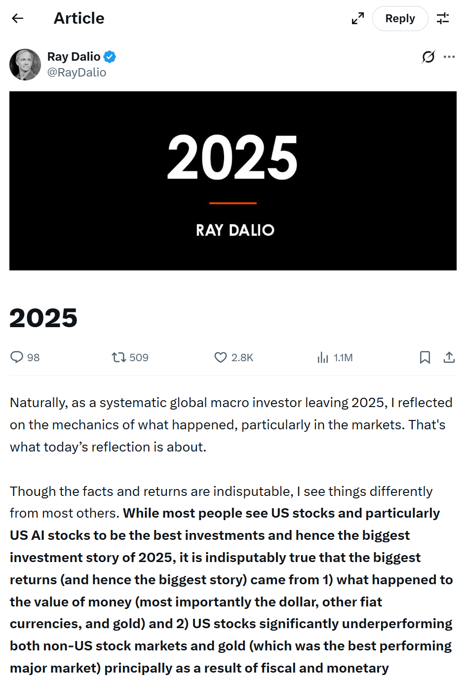 以下为达利欧2025年度复盘全文,部分内容有删减: