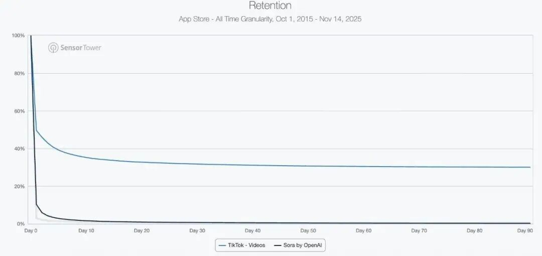 a16z合伙人Olivia Moore晒出的一组数据残酷指出:Sora 2的30天用户留存率仅1%,60天留存率直接归零。