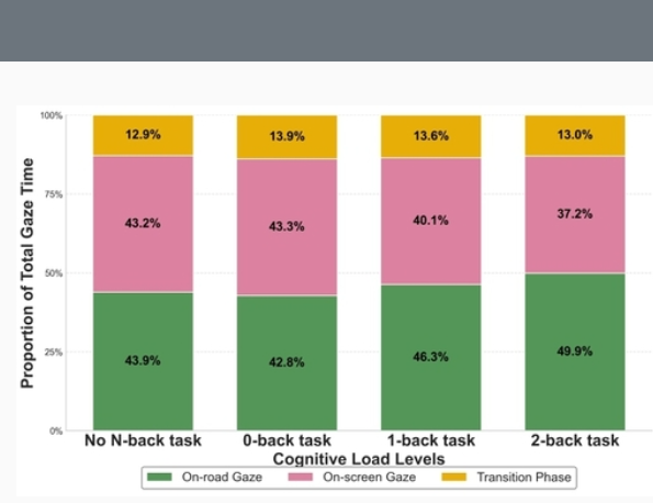 而且,随着测试难度越来越大,驾驶者的对路面的专注比例也从42.8%上升至49.8%。