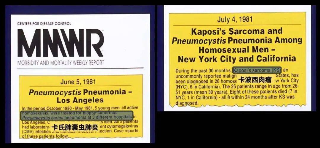 当时美国疾病控制中心在1981年6月和7月先后报道,在男同性恋人群中发现了全球极其罕见的机会性感染和肿瘤,包括卡氏肺囊虫肺炎以及卡波西肉瘤。(注:旧金山在1980年4月也有相关病例报告,但未引发广泛关注,直到1981年这个病例才被追溯认定为美国艾滋病流行的首位患者。)