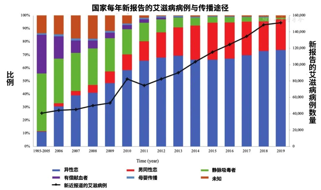 从去年到今年的研究结果表明,我们国家的高危行为已经从过去的非法采供血和静脉吸毒变成了性传播,性传播占比已经超过了98%。而由于它隐蔽性很强,防控起来也非常地困难。疫情集中在部分省份,并且在老年群体和年轻人中都存在流行的热点。
