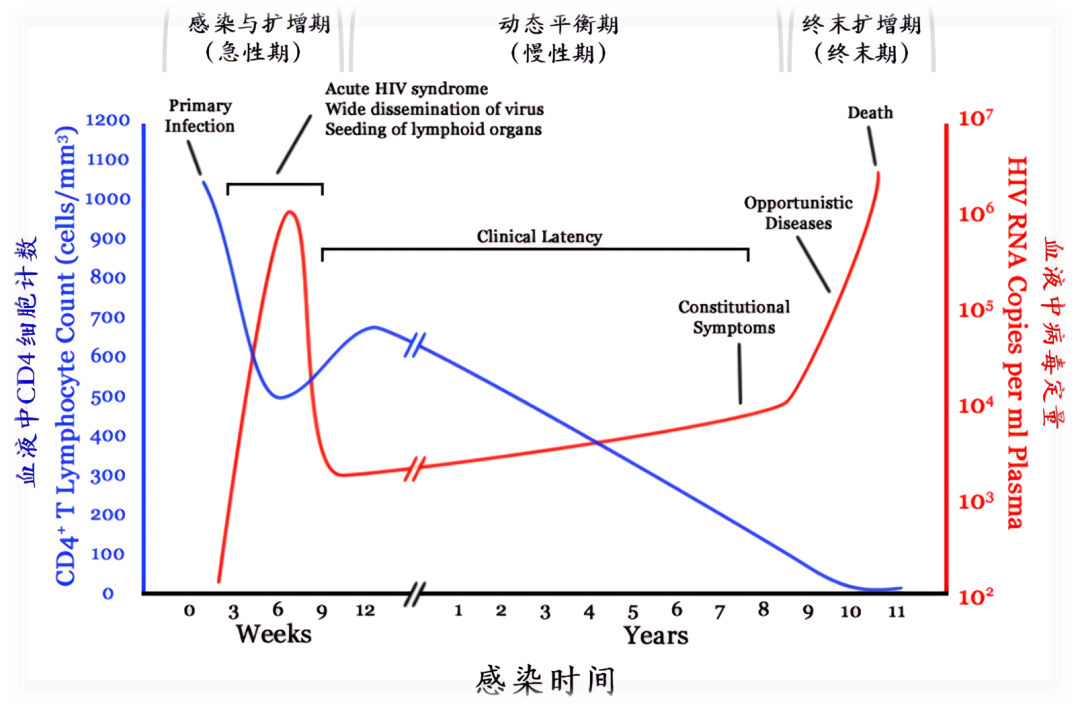 在艾滋病研究过程中,我们知道被艾滋病毒感染之后不是马上就得艾滋病的,是一个漫长的过程,平均起来差不多需要10年左右。