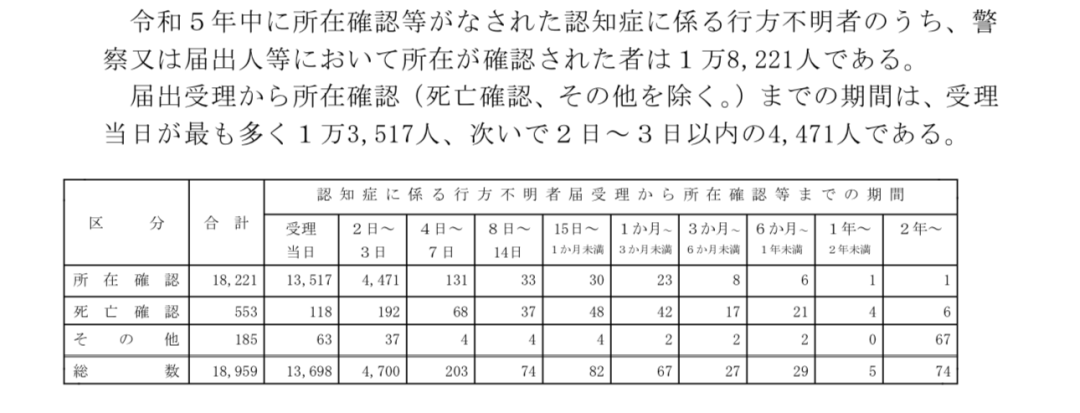而且,日本警察厅还给出一个非常特别的数据——在亲人失踪的当日,家人大多会选择报警求助,但失踪超过一周后,报警救助的人数就大大减少。