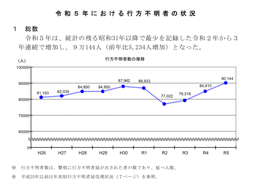 根据日本警察厅发布的报告,2023年是近10年内“蒸发者”最多的一年,达到90144人。其中男性占63.7%,女性占36.3%。年龄则以20-30岁这个层级为最多。